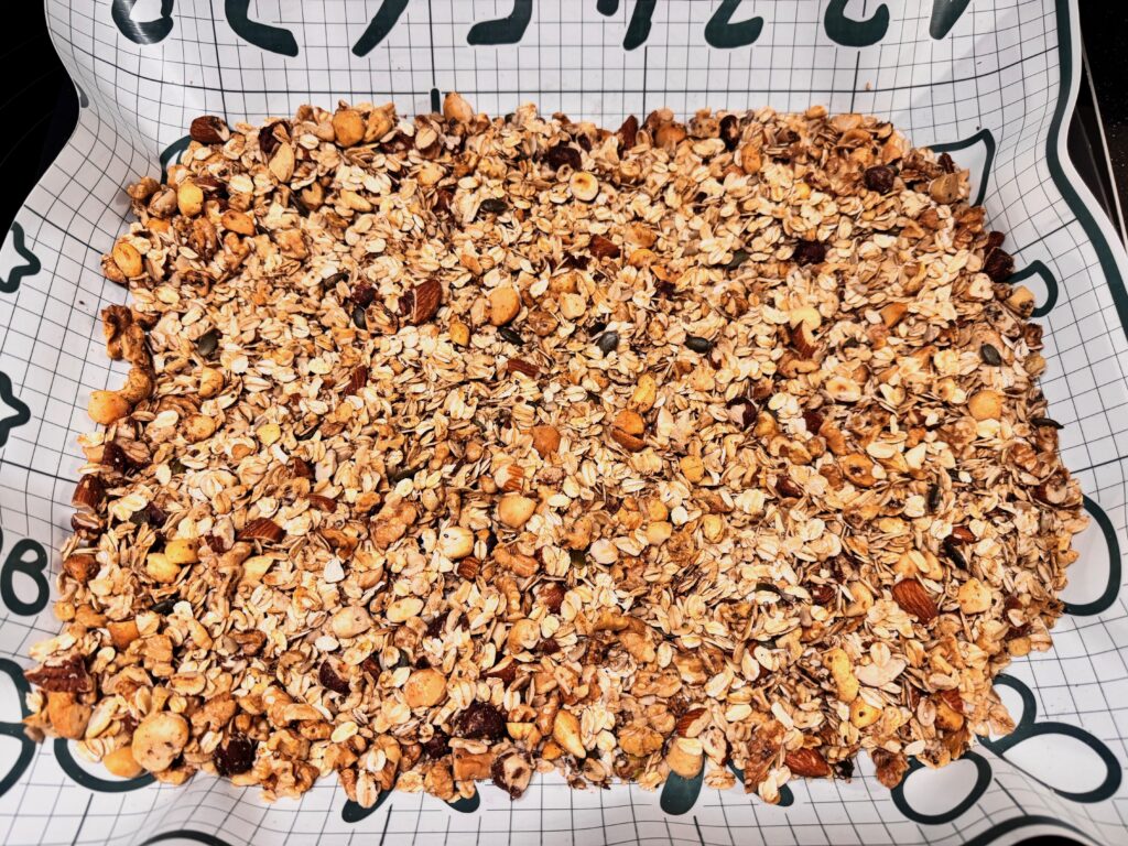 Je kunt later nog andere ingrediënten toevoegen. Denk aan lijnzaad, maanzaad, chiazaad, hennepzaad, goji-bessen, rozijnen, etc….